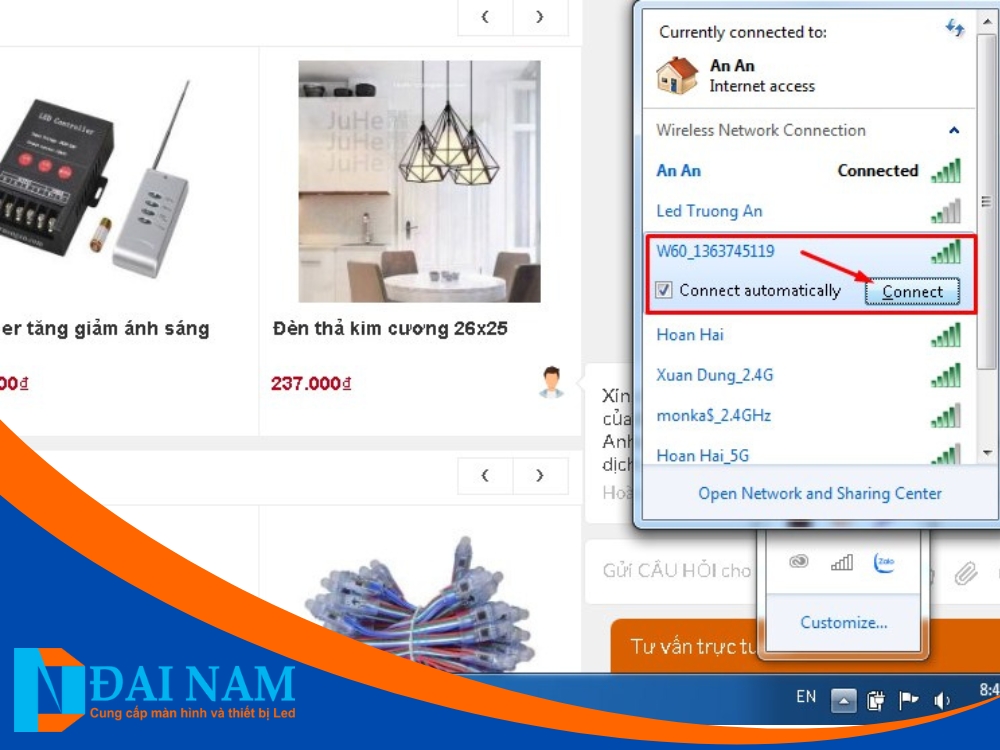 Bước 1: Mở biểu tượng wifi trên laptop tìm tên wifi mạch điều khiển kết nối muốn đổi mật khẩu.