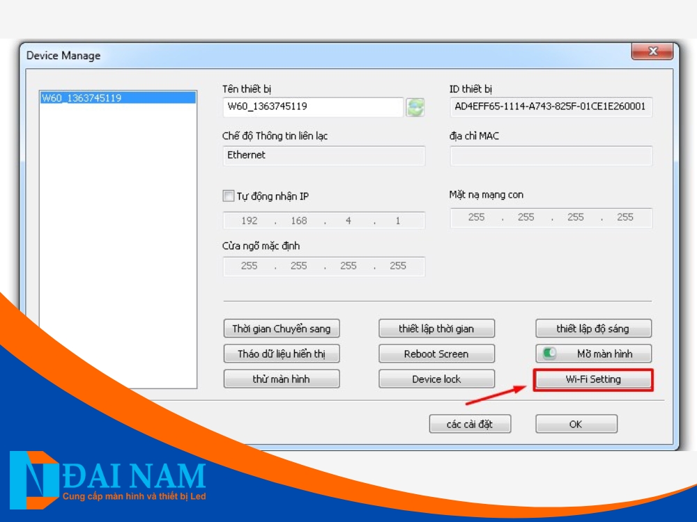 Bước 4: Trên cửa sổ Device Mananer chọn Wifi Setting để thay đổi mật khẩu và tên wifi cho mạch điều khiển.