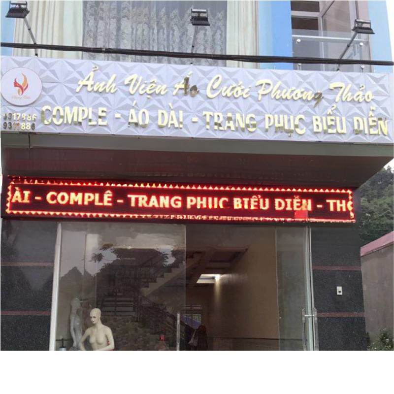 Ví dụ như, Ảnh viện áo cưới Phương Thảo đã sử dụng bảng led matrix chạy chữ “Áo dài – Comple – Trang phục biểu diễn“, giúp người đi đường dễ dàng hình dung cửa hàng đang cung cấp những dịch vụ và mặt hàng nào.
